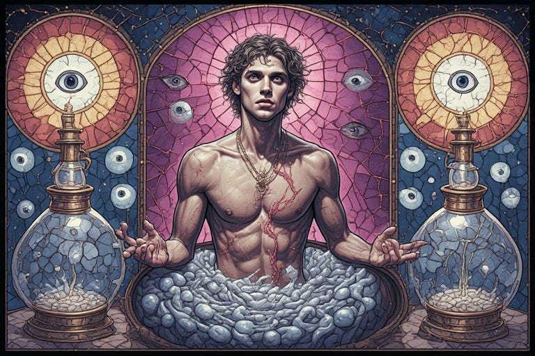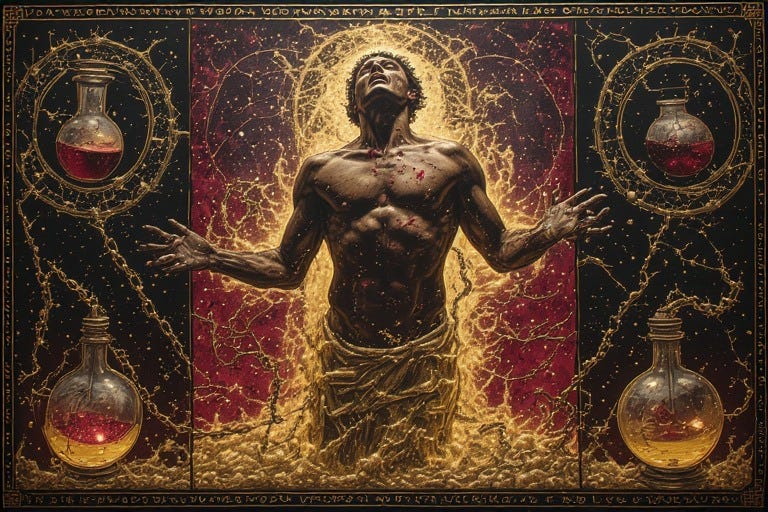 The Queer Alchemist in Rubedo holds a goblet of his own making—a vessel containing droplets collected from his body’s many fountains. Within this chalice, substances once deemed profane now shimmer with sacred potential: the salt of tears, the iron tang of blood, the milky essence of seed, the amber filtration of kidneys, the slick evidence of exertion. He sees how each carries the same molecular memory as rain and sea, each a different dialect of the same primordial language that has flowed through every creature since life’s first stirring.
