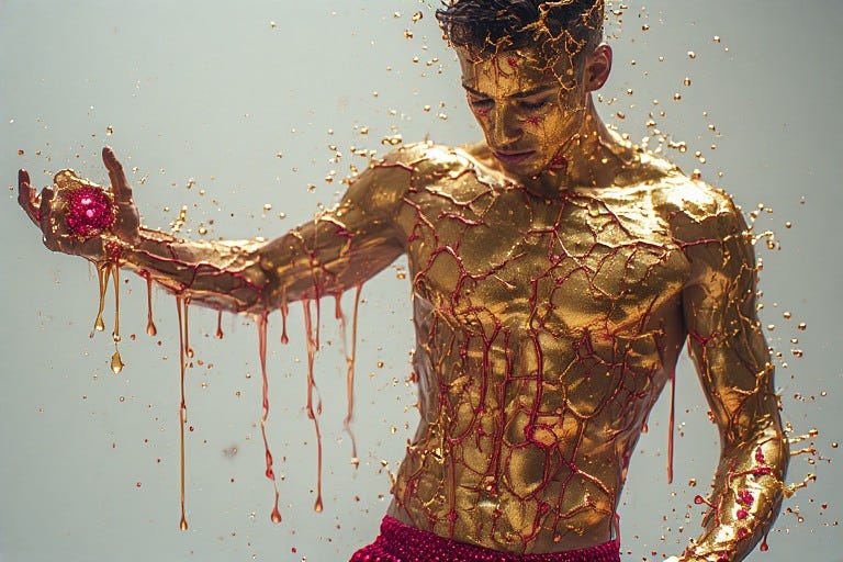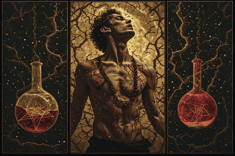 The Rubedo phase reveals a paradox: what the world labels weakness becomes the alchemist’s greatest power. When the queer male body trembles with emotion, bleeds from wounds both visible and hidden, yields to pleasure or pain—this permeability to experience is not a flaw to overcome but the very essence of his magic. For only what can be touched can also touch; only what can be pierced can also receive; only what acknowledges its own mortality can truly celebrate its momentary radiance.