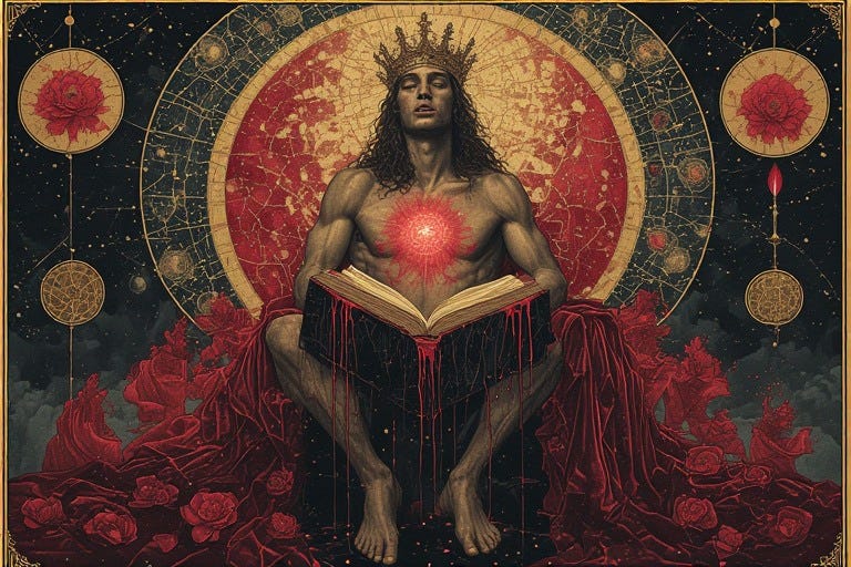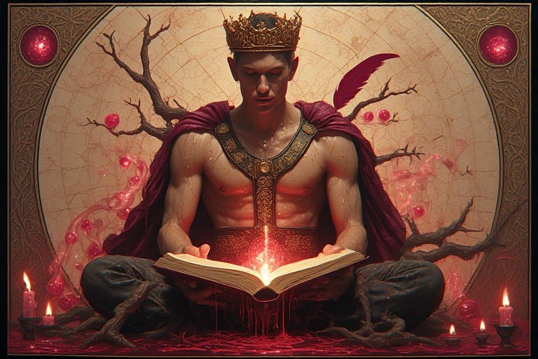 When the queer male alchemist crosses the ruby threshold into Rubedo’s final chamber, four distinct realms of power unfold before him like petals of a crimson flower, each realm bearing its own gleaming crown of self-mastery.