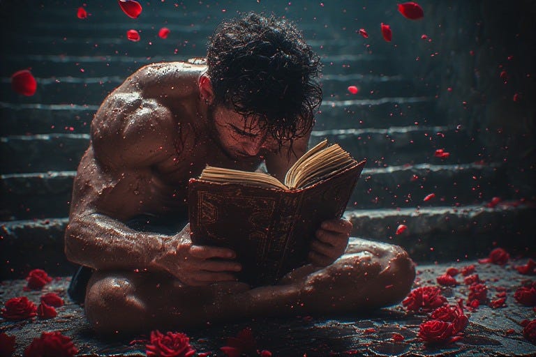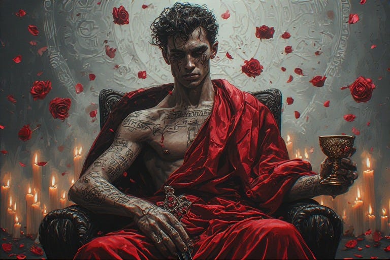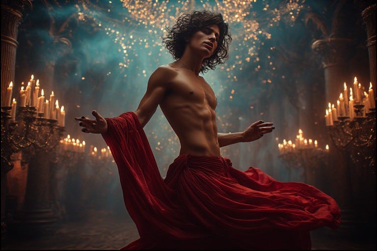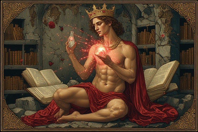 Having walked through the black fire of Nigredo, washed himself in Albedo’s silver waters, and found his voice in Citrinitas’s golden light, the queer male alchemist now stands before Rubedo’s final mystery. Here at last, the body’s hungers—those desires he once buried, disguised, or apologized for—reveal themselves not as sins to overcome but as sacred pathways. What society named shameful, what religions condemned as abomination, what he himself once feared as weakness, now pulses with holy significance. The flesh becomes not obstacle to spirit but its very temple.