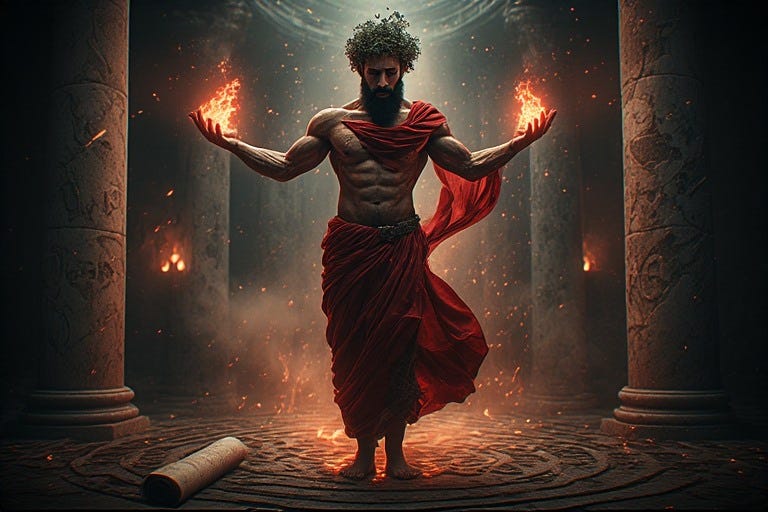 Beads of moisture glisten on his skin—sacred evidence of labor in the Great Work. Like a forge radiating heat, his body emanates warmth that touches those around him, kindling in them the first spark of their own potential metamorphosis.