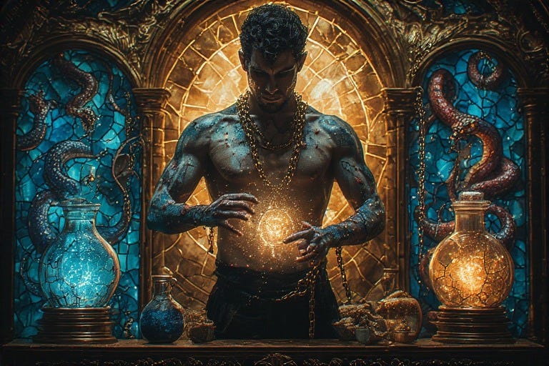 Here lies the most profound enchantment: discovering that what you sought through ritual and study has dwelled within your flesh from the beginning. You, the Queer Male Alchemist, embody the Philosopher’s Stone itself. When you enter a room, the very air transmutes—your wounds become your power, your exclusion becomes your insight, and where others demanded your silence, you now stand crowned in unapologetic luminosity.