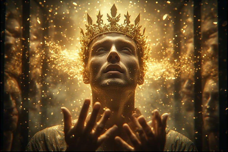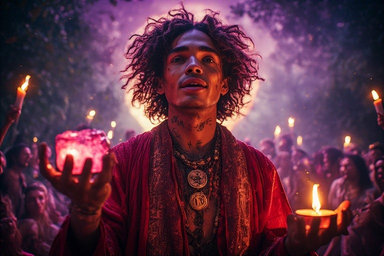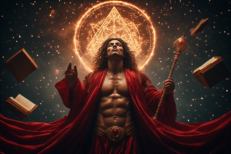 Through the Crown of Creative Manifestation his hands become vessels of power, each gesture and daily task infused with alchemical intent. The mundane transforms into sacred text—an email composed with crystalline precision, a meal prepared as devotional offering, casual sex elevated to ceremonial exchange. Some men will channel this energy into art: canvases blooming with color, stages ignited by movement, pages filled with incantations. Others will embody it through social justice, healing work, guiding communities, tending spirits, raising children, or perfecting their craft.