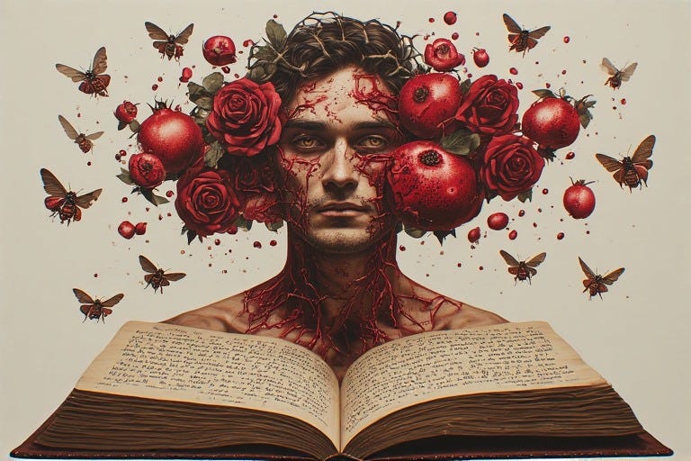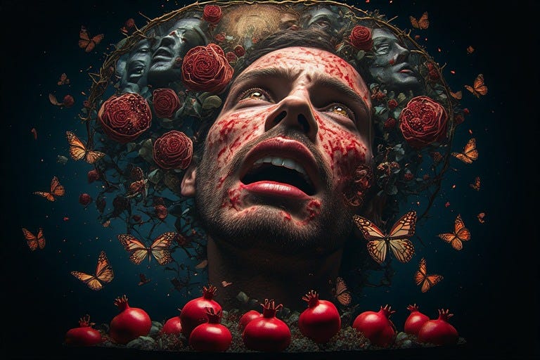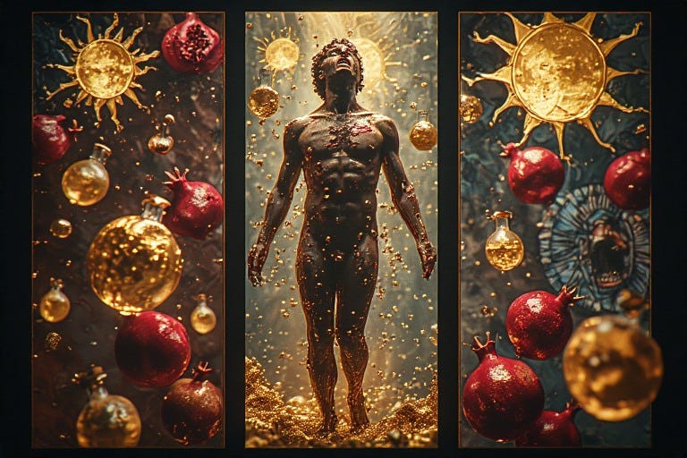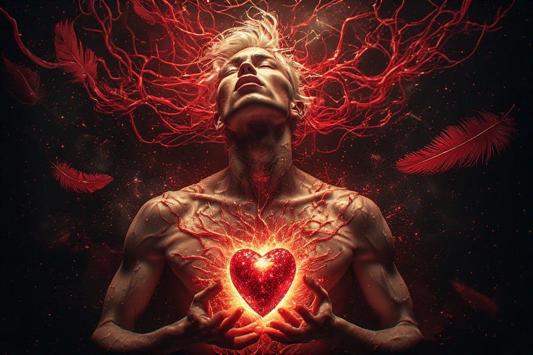 Finally comes integration. Everything unites in the profound song of blood: vermilion rushing thick and vital, lush as split pomegranate, unbreakable—darkness reborn as a single luminous heartbeat, all fragments united in the body’s consummated fire, organs humming in perfect harmony like instruments tuned to the same sacred frequency, consciousness no longer contained within the skull but pulsing through every cell like liquid rubies.
