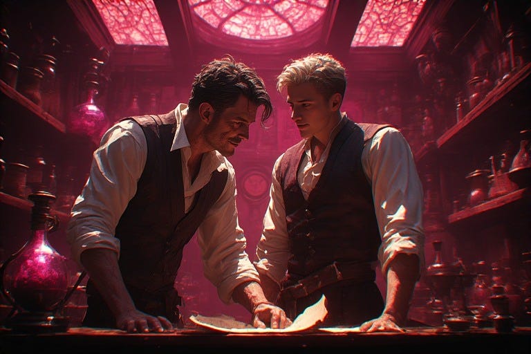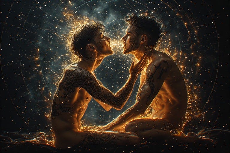 Hyperion reveals a profound truth: beyond biological inheritance flows what he terms a “love lineage”—a current connecting each Queer Alchemist to others across the centuries through their shared capacity for male-to-male love. While blood ancestry might be visualized as a crimson thread spanning generations, the heritage of men who love men shimmers as a pink thread. This connection manifests not through genetic material but through moments of recognition—that electric instant when queer eyes meet across a room and silently acknowledge: “I see you. You exist as I exist.”